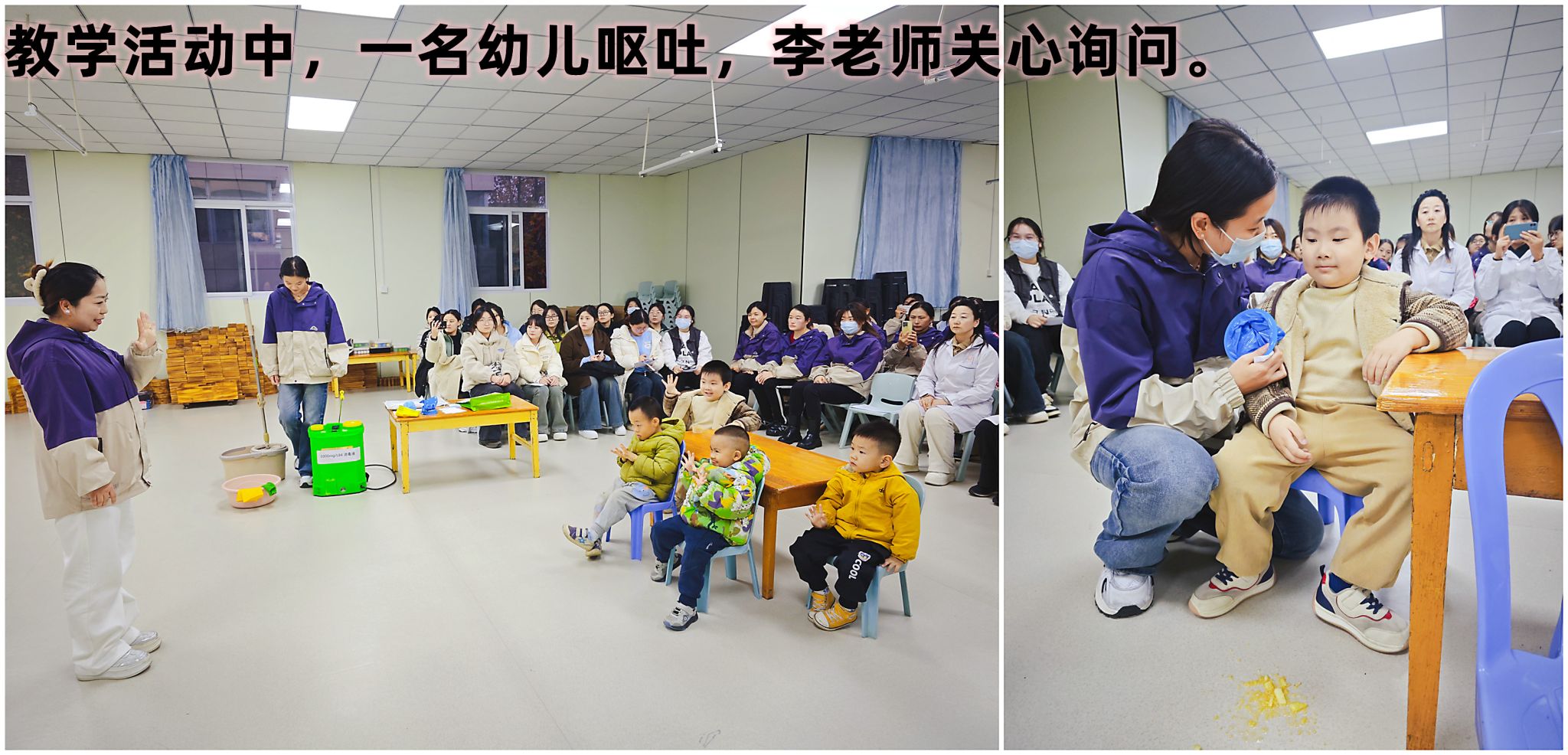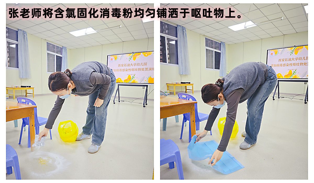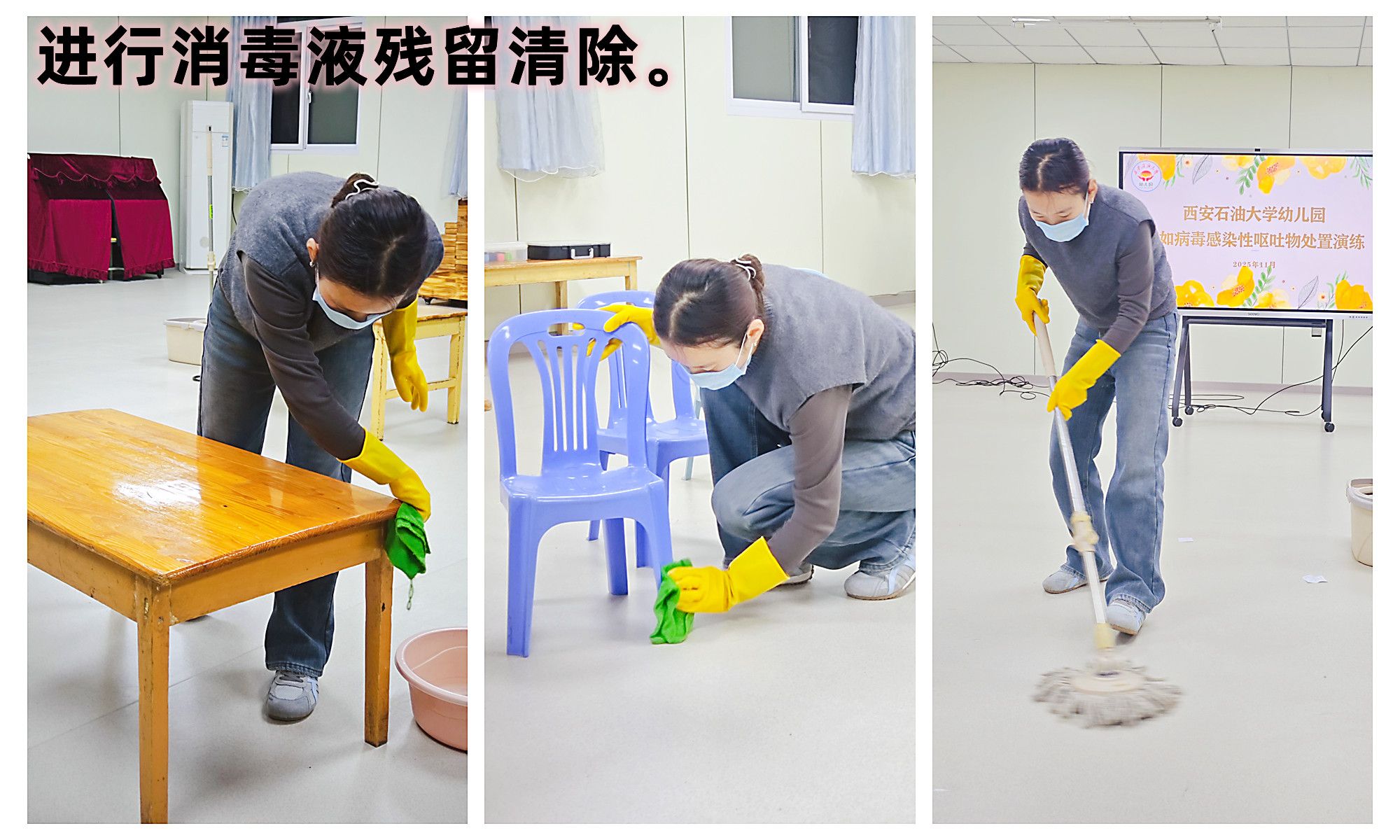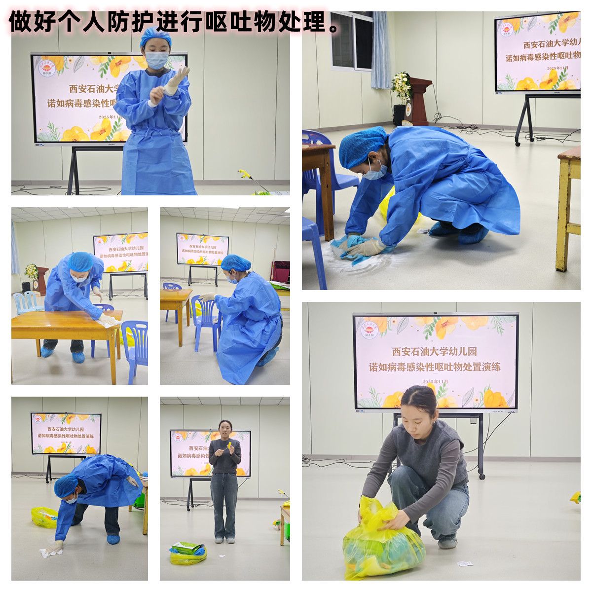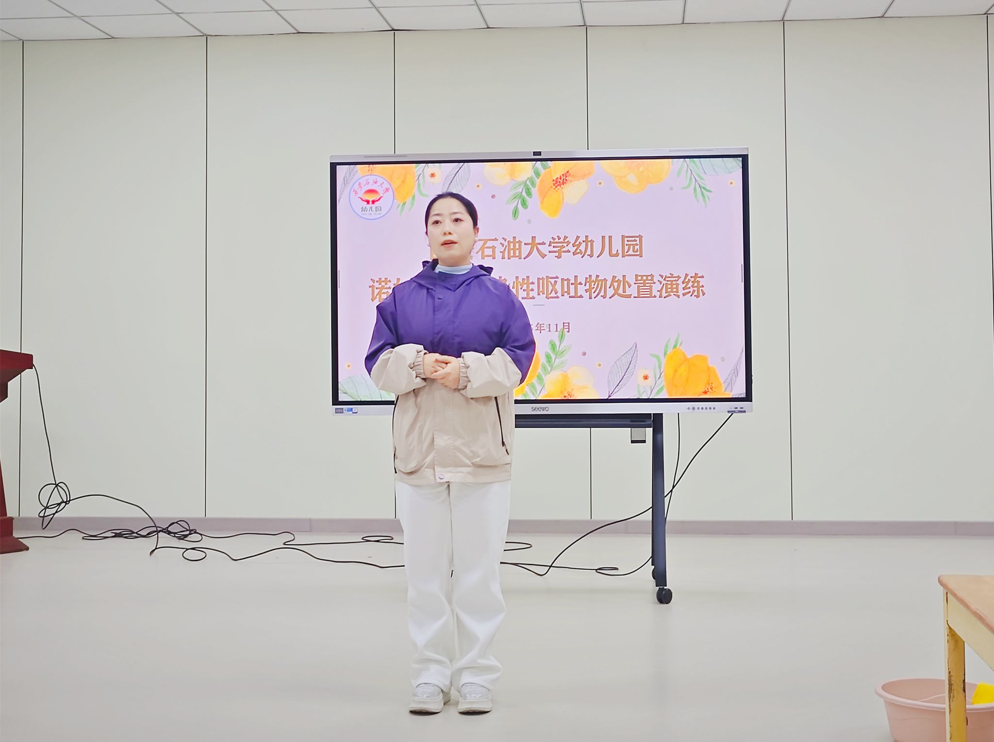 秋冬交替之际,诺如病毒感染进入高发期,急性感染性腹泻的防控工作成为幼儿园健康管理的重中之重。为全面夯实校园传染病防控屏障,推动应急处置流程的规范化落地,提升教职工对突发公共卫生事件的快速响应与协同作战能力,西安石油大学幼儿园于2025年11月20日开展诺如病毒感染性呕吐物处置演练,全园教职工、实习生及见习生共同参与。