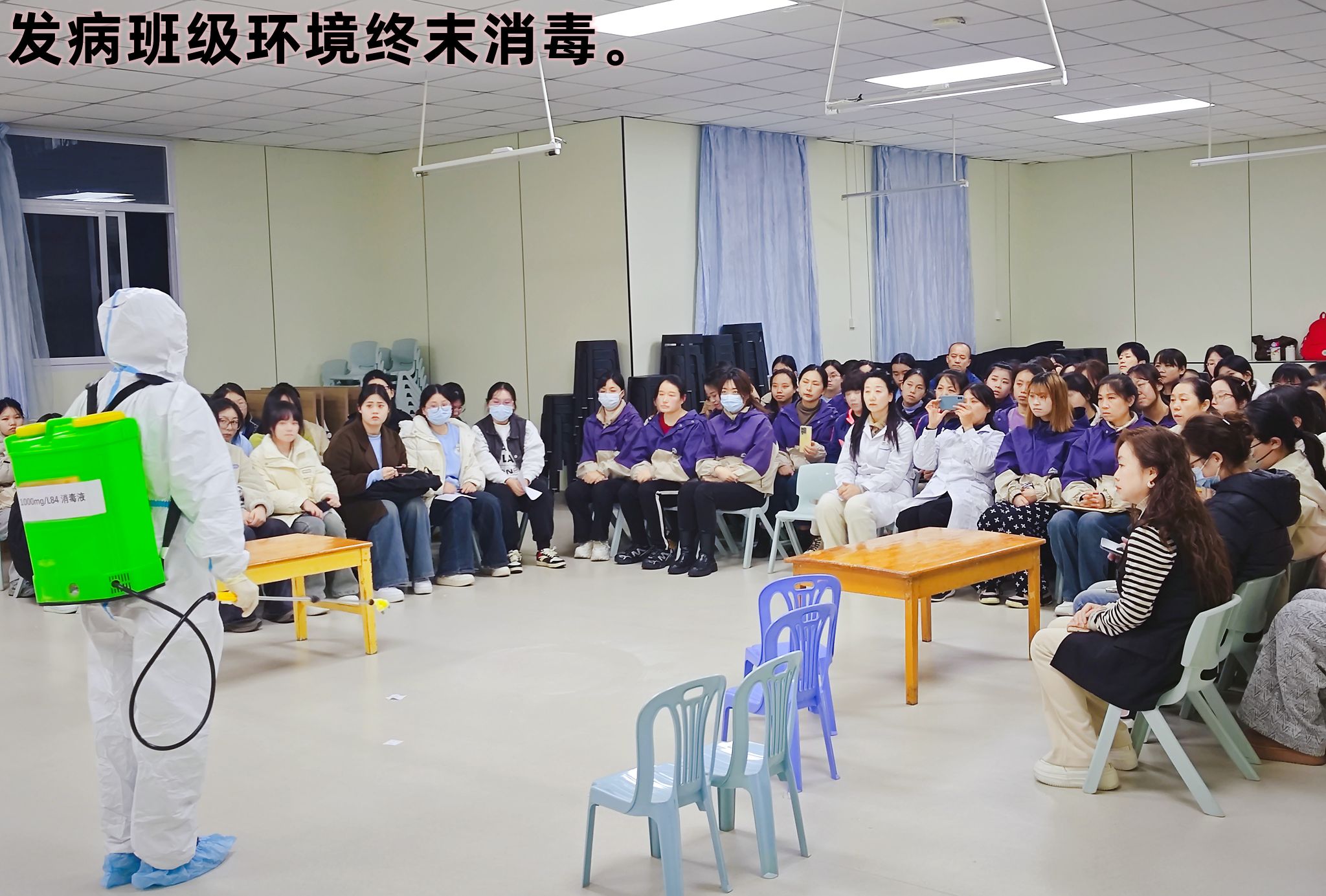 演练2:保健医生到达班级现场,指导开展呕吐物处置,张老师迅速关闭班级空调、风扇、门窗,防止病毒通过气溶胶进一步扩散。随后,张老师严格按照操作流程,使用呕吐包对呕吐物进行妥善处理。处理完毕,又配制含有效氯1000mg/L的消毒液,对班级的各个角落进行喷洒式终末消毒,确保环境安全。