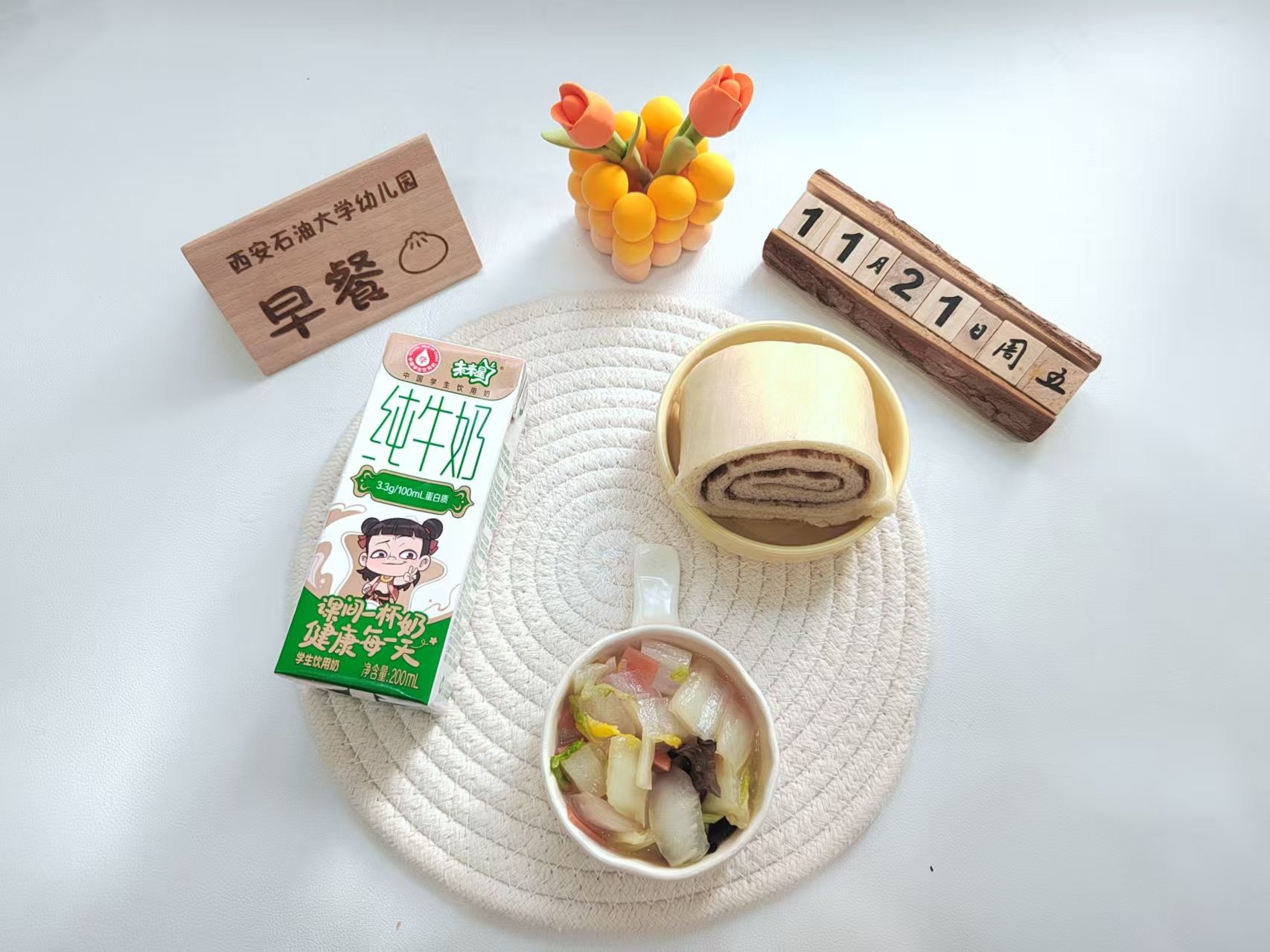 早餐:牛奶(替:鸡蛋汤)、芝麻酱卷、醋溜白菜