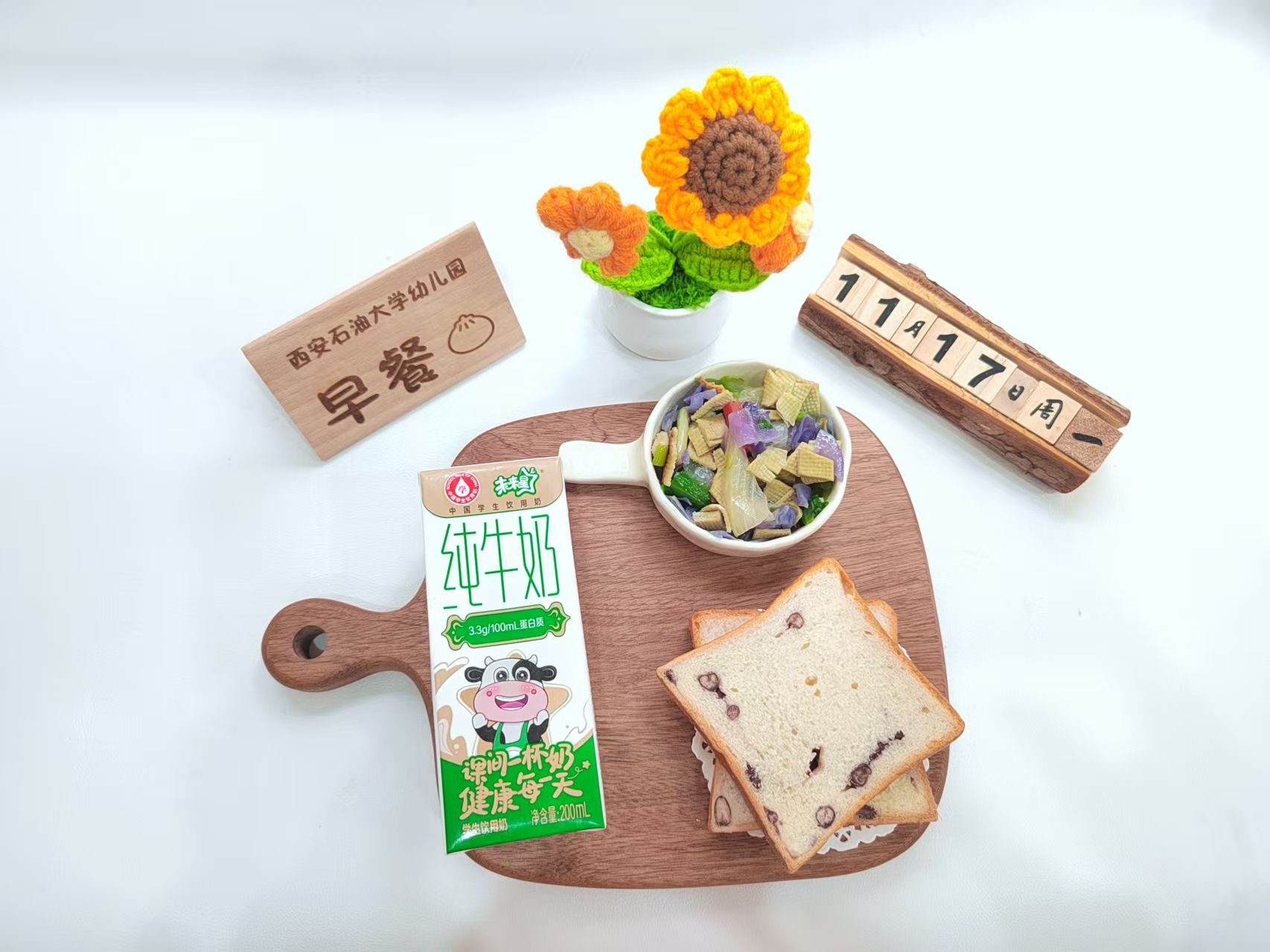早餐:牛奶(替:鸡蛋汤)、小红豆吐司、鲜蔬素炒四宝