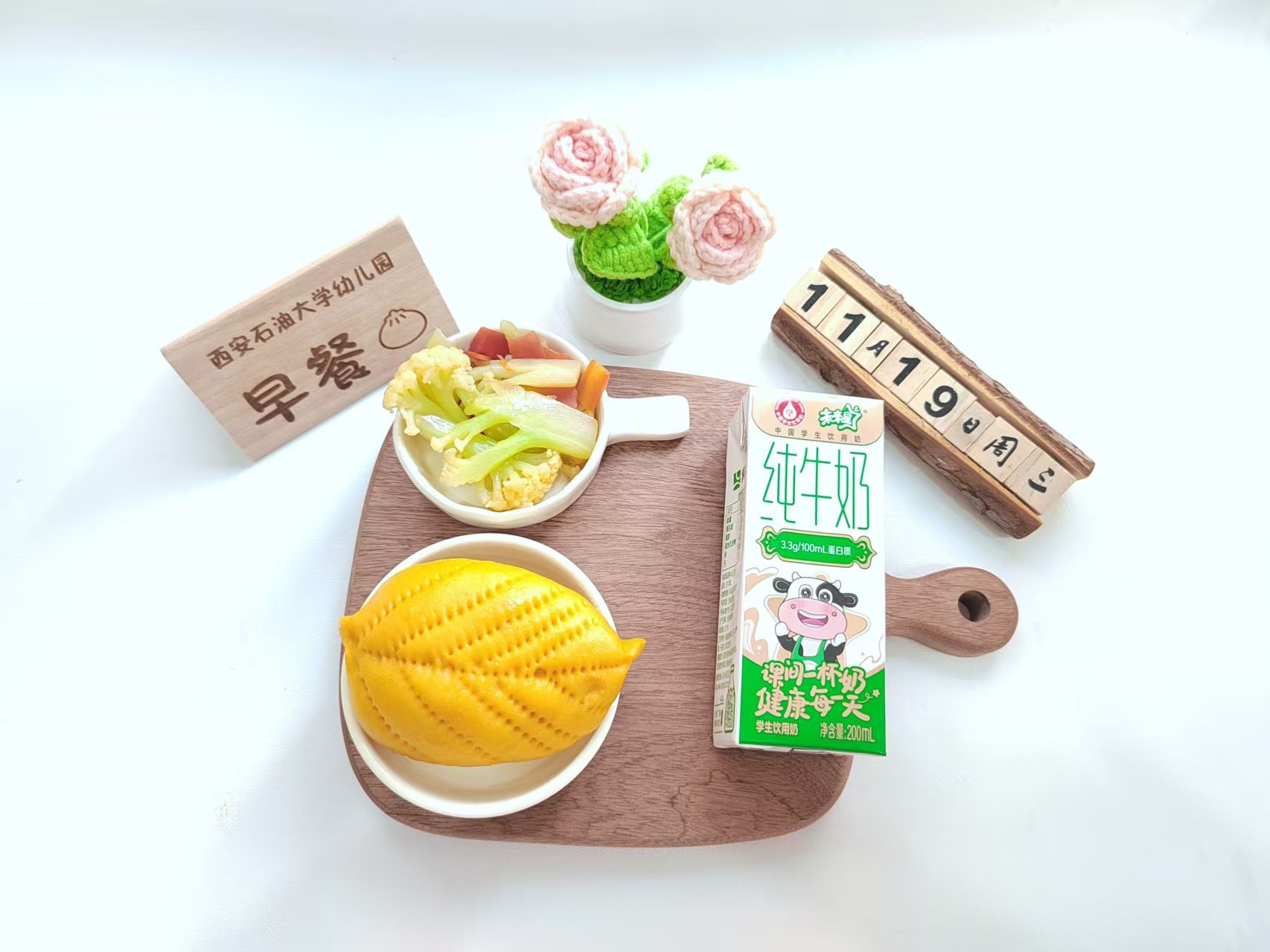 早餐:牛奶(替:鸡蛋汤)、金叶南瓜馒头、胡萝卜菜花小炒