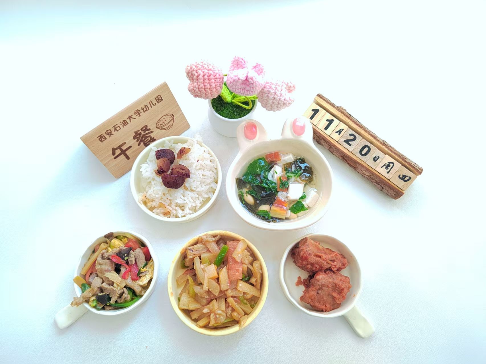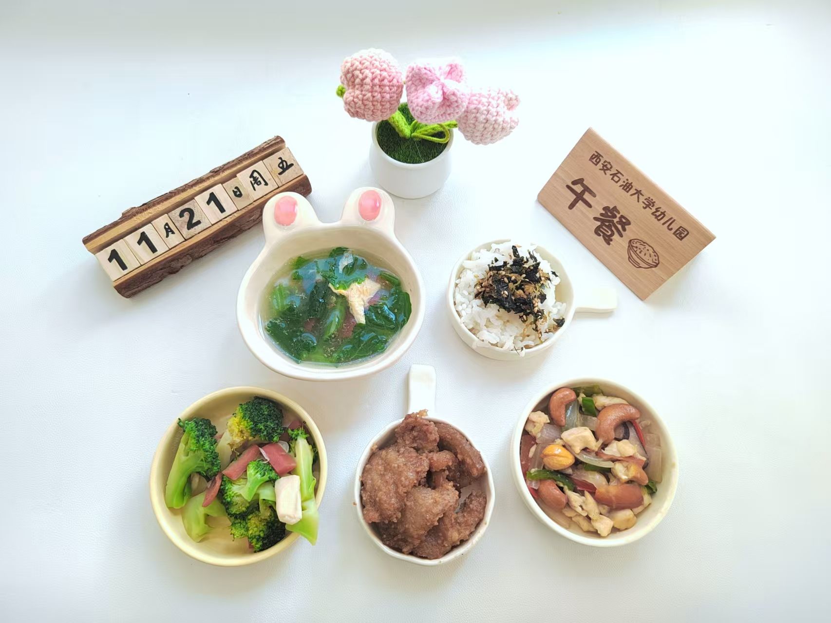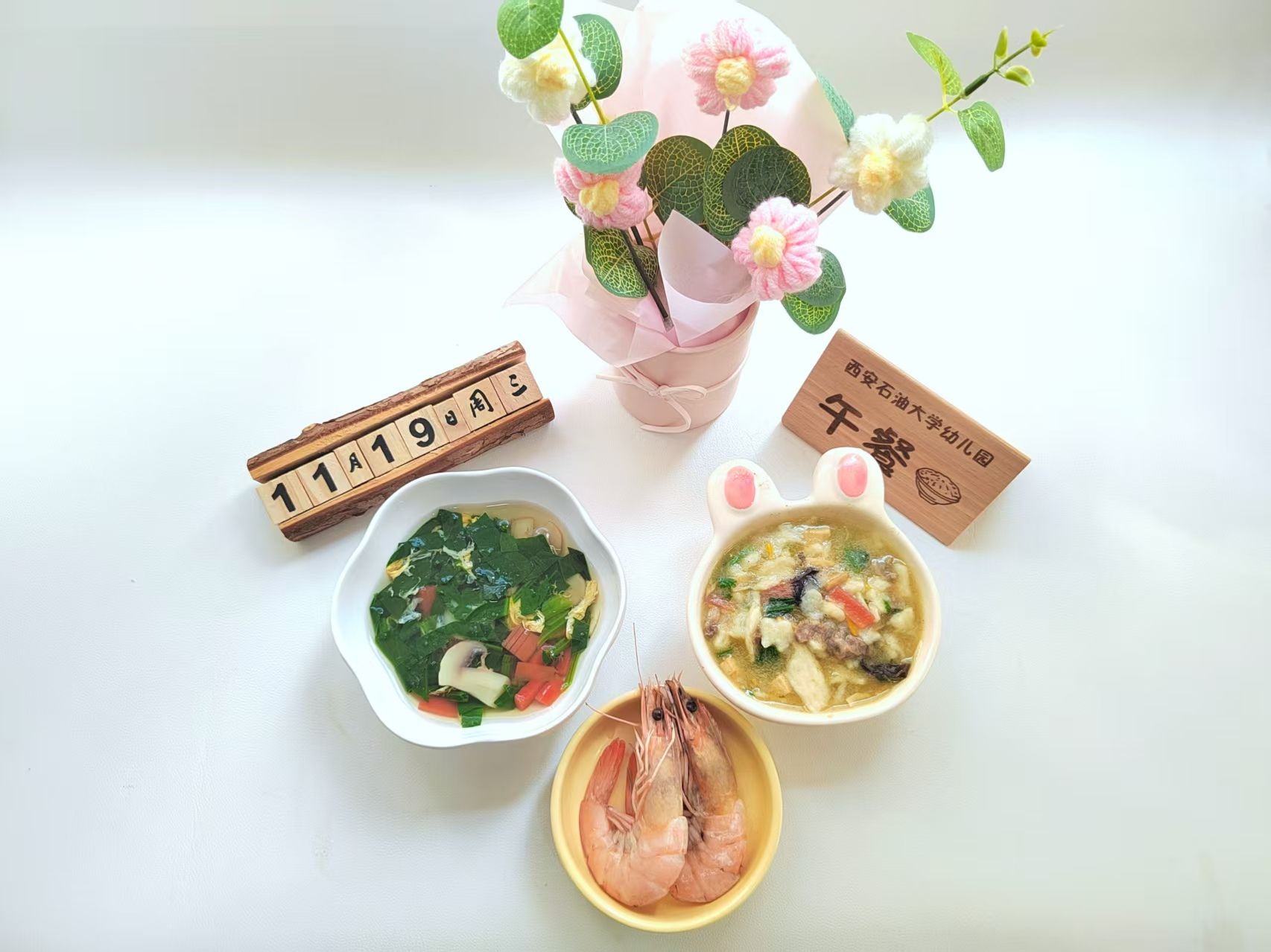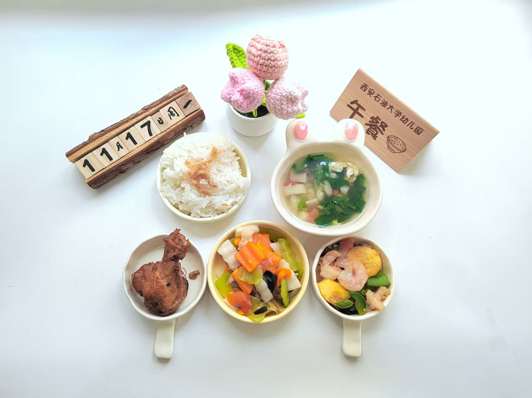 午餐:肉松米饭、红烧翅根、虾仁豆腐煲、荷塘小炒、杂菌蛋花汤