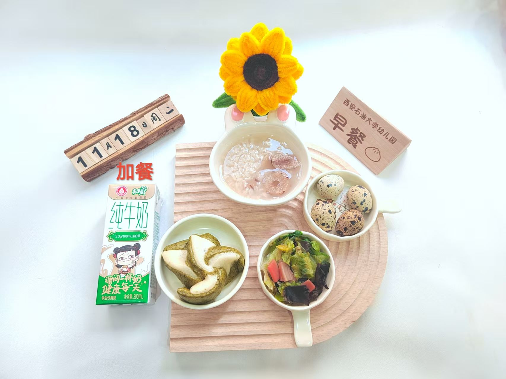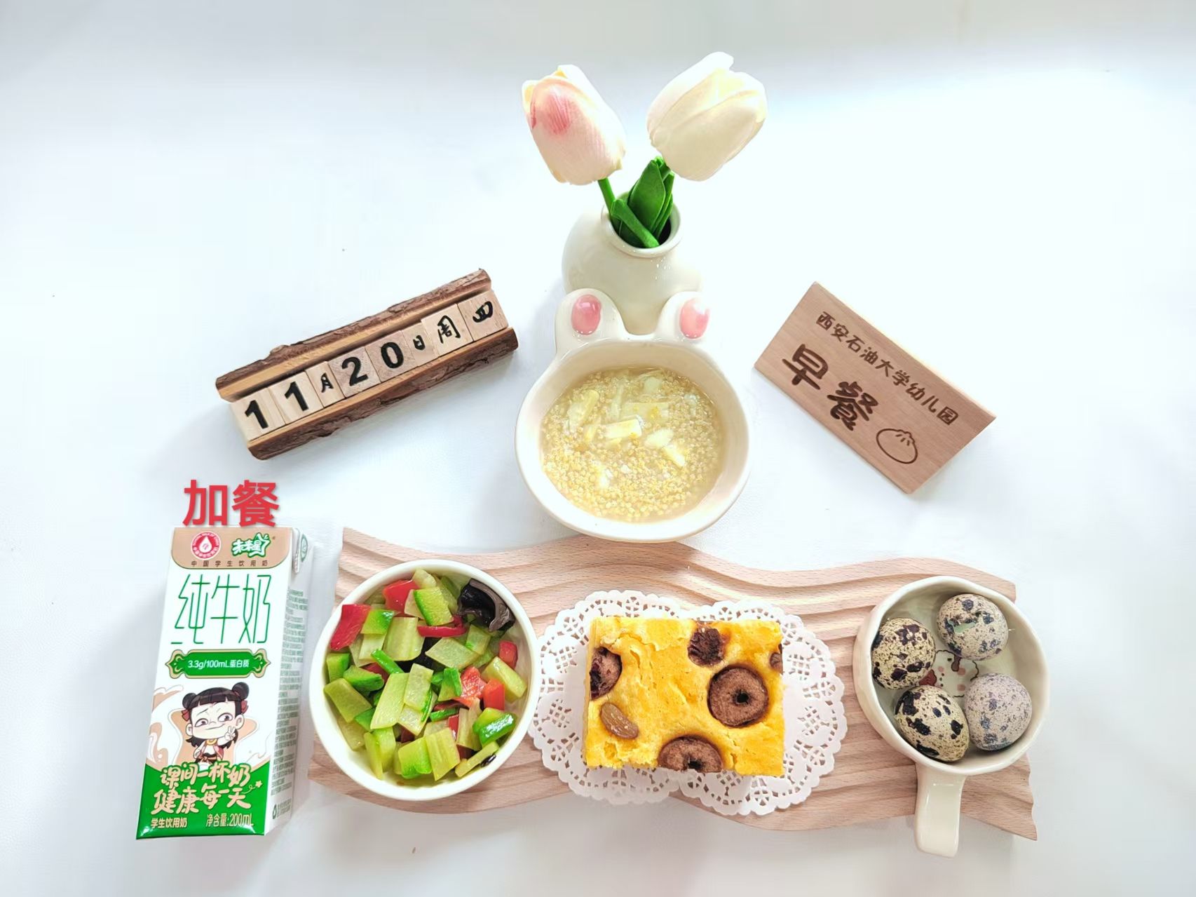 早餐、加餐:红薯小米粥、玉米面发糕、缤纷佛手瓜快炒、鹌鹑蛋(替:豆腐干)、牛奶